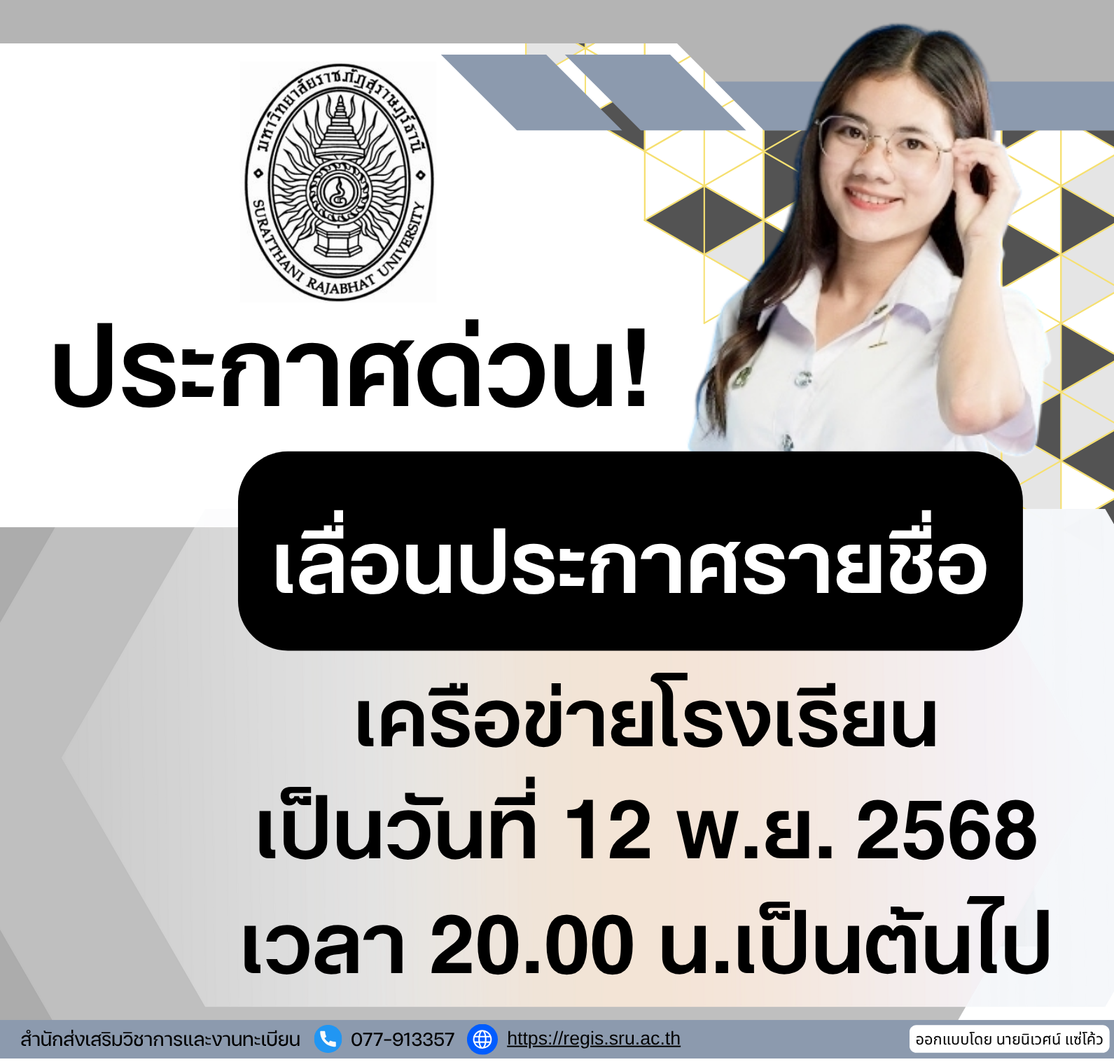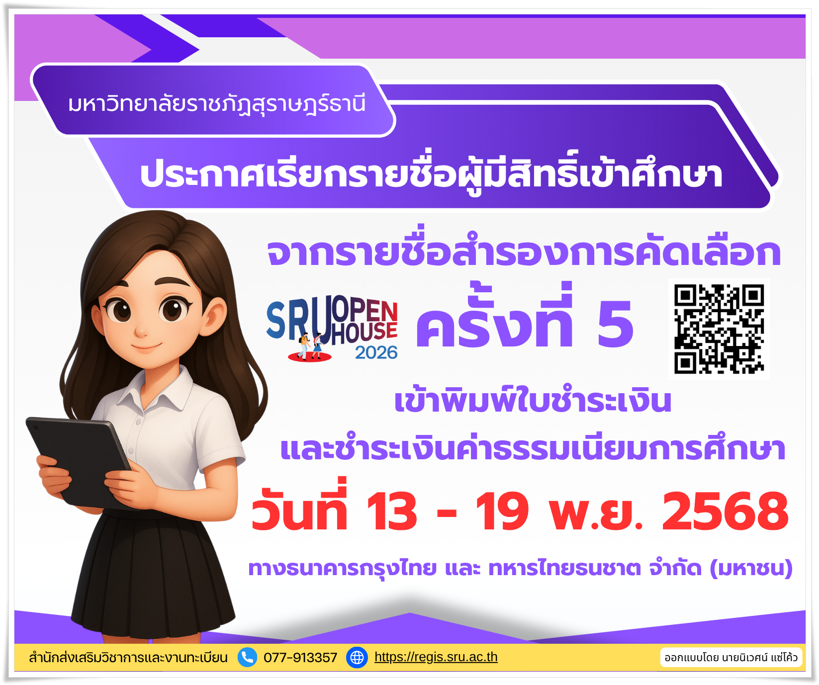 มหาวิทยาลัยราชภัฏสุราษฎร์ธานี ประกาศเรียกรายชื่อผู้มีสิทธิ์เข้าศึกษา จากรายชื่อสำรองการคัดเลือก ครั้งที่ 5 เข้าพิมพ์ใบชำระเงินและชำระเงินค่าธรรมเนียมการศึกษา วันที่ 13 – 19 พ.ย. 2568 ทางธนาคารกรุงไทย และ ทหารไทยธนชาต จำกัด (มหาชน) รายชื่อผู้มีสิทธิ์เข้าศึกษา จากรายชื่อสำรองการคัดเลือก ครั้งที่ 5Download