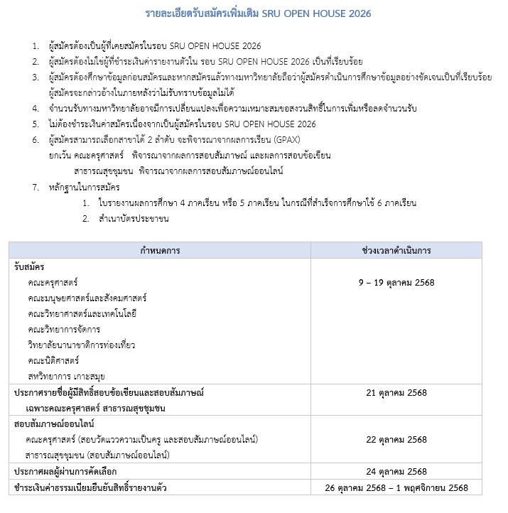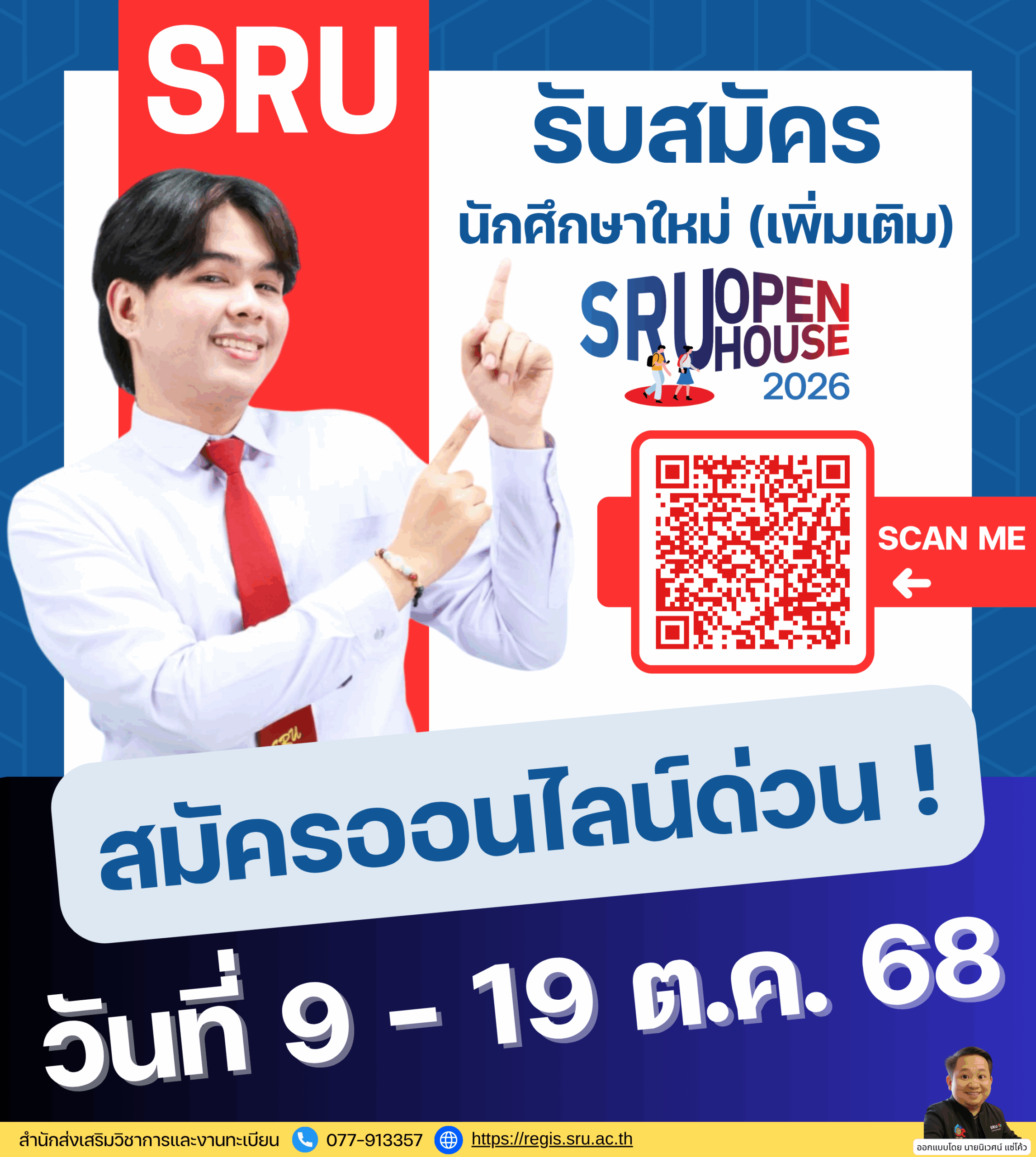 มหาวิทยาลัยราชภัฏสุราษฎร์ธานี รับสมัครนักศึกษาใหม่ (เพิ่มเติม) SRU Open House 2026 สมัครออนไลน์ด่วน ! วันที่ 9 – 19 ต.ค. 68 October 9, 2025 นิเวศน์ แซ่โค้ว ข่าวสารรับสมัคร Share This Twitter Facebook Pinterest LinkedIn นิเวศน์ แซ่โค้ว Related Posts มหาวิทยาลัยราชภัฏสุราษฎร์ธานี ประกาศเรียกรายชื่อผู้มีสิทธิ์เข้าศึกษา จากรายชื่อสำรองการคัดเลือก ครั้งที่ 4 เข้าพิมพ์ใบชำระเงินและชำระเงินค่าธรรมเนียมการศึกษา วันที่ 10 – 16 ต.ค. 2568 ทางธนาคารกรุงไทย และ ทหารไทยธนชาต จำกัด (มหาชน) ประกาศเรียกรายชื่อผู้มีสิทธิ์เข้าศึกษา จากรายชื่อสำรองการคัดเลือก ครั้งที่ 4Download ประกาศรายชื่อผู้ชำระเงินเข้าเป็นนักศึกษาใหม่ มหาวิทยาลัยราชภัฏสุราษฎร์ธานี ประจำปีการศึกษา 2569 (ครั้งที่ 3) เป็นผู้ชำระเงินถึงวันที่ 22 กันยายน 2568 มหาวิทยาลัยราชภัฏสุราษฎร์ธานี ประกาศเรียกรายชื่อผู้มีสิทธิ์เข้าศึกษา จากรายชื่อสำรองการคัดเลือก ครั้งที่ 3 เข้าพิมพ์ใบชำระเงินและชำระเงินค่าธรรมเนียมการศึกษา วันที่ 26 ก.ย. – 3 ต.ค. 2568 ทางธนาคารกรุงไทย และ ทหารไทยธนชาต จำกัด (มหาชน) ประกาศรายชื่อสำรอง ครั้งที่ 3Download