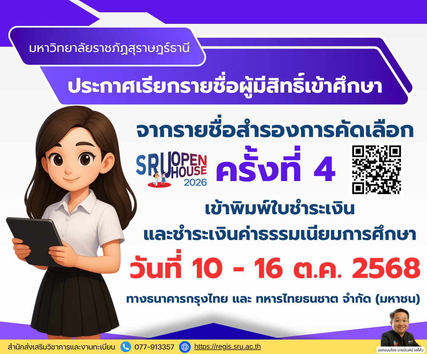 มหาวิทยาลัยราชภัฏสุราษฎร์ธานี ประกาศเรียกรายชื่อผู้มีสิทธิ์เข้าศึกษา จากรายชื่อสำรองการคัดเลือก ครั้งที่ 4 เข้าพิมพ์ใบชำระเงินและชำระเงินค่าธรรมเนียมการศึกษา วันที่ 10 – 16 ต.ค. 2568 ทางธนาคารกรุงไทย และ ทหารไทยธนชาต จำกัด (มหาชน) ประกาศเรียกรายชื่อผู้มีสิทธิ์เข้าศึกษา จากรายชื่อสำรองการคัดเลือก ครั้งที่ 4Download