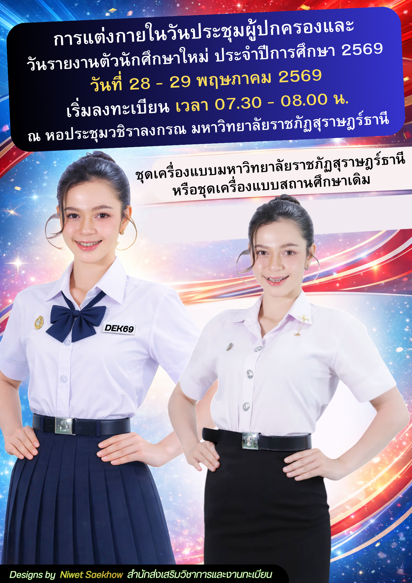 การแต่งกายในวันประชุมผู้ปกครองและวันรายงานตัวนักศึกษาใหม่ ประจำปีการศึกษา 2569 ชุดเครื่องแบบมหาวิทยาลัยราชภัฏสุราษฎร์ธานี หรือชุดเครื่องแบบสถานศึกษาเดิม วันที่ 28 – 29 พฤษภาคม 2569 เริ่มลงทะเบียน เวลา 07.30 – 08.00 น. ณ หอประชุมวชิราลงกรณ มหาวิทยาลัยราชภัฏสุราษฎร์ธานี