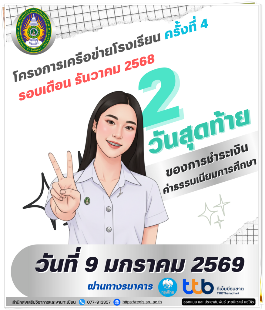 พิมพ์ใบชำระเงินค่าธรรมเนียมการศึกษา ชำระเงินค่าธรรมเนียมการศึกษา วันที่ 26 ธ.ค. 2568 – 9 ม.ค. 2569 ผ่านทางเว็บไซต์ https://reg.sru.ac.th/registrar/apphome.asp สำหรับนักเรียน ที่ชื่อนามสกุลไม่ถูกต้อง หรือ เข้าระบบไม่ได้ ให้ติดต่อ โทร 077-913357…