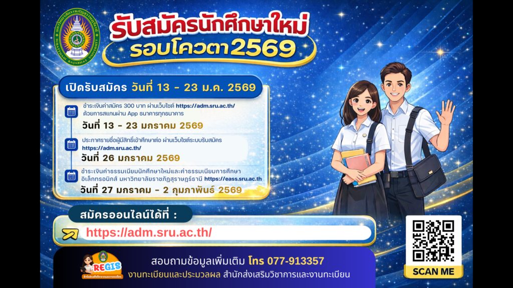 มหาวิทยาลัยราชภัฏสุราษฎร์ธานี เปิดรับสมัครนักศึกษาใหม่ รอบโควตา 2569 ผ่านระบบออนไลน์ เริ่มสมัครพรุ่งนี้วันแรก วันที่ 13 มกราคม 2569 เวลา 10.00 น. เป็นต้นไป ถึงวันที่ 23 มกราคม 2569 January 12, 2026 นิเวศน์ แซ่โค้ว ข่าวสารรับสมัคร คลิกเข้าสู่ระบบรับสมัครนักศึกษาใหม่ออนไลน์ ประกาศมหาวิทยาลัยราชภัฏสุราษฎร์ธานี เรื่อง การรับสมัครนักศึกษาใหม่ รอบโควตา ประจำปีการศึกษา 2569Download คลิกดูสาขาวิชาที่เปิดรับสมัคร รอบโควตา ประจำปีการศึกษา 2569Download Share This Twitter Facebook Pinterest LinkedIn นิเวศน์ แซ่โค้ว Related Posts วันนี้ วันสุดท้าย ของการชำระเงินค่าธรรมเนียมการศึกษา สำหรับผู้สมัครโครงการเครือข่ายโรงเรียน ครั้งที่ 4 รอบเดือน ธันวาคม 2568 ชำระเงินผ่านทางธนาคารกรุงไทย และ ธนาคารทหารไทยธนชาต จำกัด (มหาชน) ภายในวันที่ 9 มกราคม 2569 เท่านั้น 2 วันสุดท้าย ของการชำระเงินค่าธรรมเนียมการศึกษา สำหรับผู้สมัครโครงการเครือข่ายโรงเรียน ครั้งที่ 4 รอบเดือน ธันวาคม 2568 ชำระเงินผ่านทางธนาคารกรุงไทย และ ธนาคารทหารไทยธนชาต จำกัด (มหาชน) ภายในวันที่ 9 มกราคม 2569 เท่านั้น ประกาศรายชื่อ โครงการเครือข่ายโรงเรียน ครั้งที่ 4 รอบเดือน ธันวาคม 2568 พิมพ์ใบชำระเงินค่าธรรมเนียมการศึกษา ชำระเงินค่าธรรมเนียมการศึกษา วันที่ 26 ธ.ค. 2568 – 9 ม.ค. 2569 ผ่านทางเว็บไซต์ https://reg.sru.ac.th/registrar/apphome.asp สำหรับนักเรียน ที่ชื่อนามสกุลไม่ถูกต้อง หรือ เข้าระบบไม่ได้ ให้ติดต่อ โทร 077-913357…