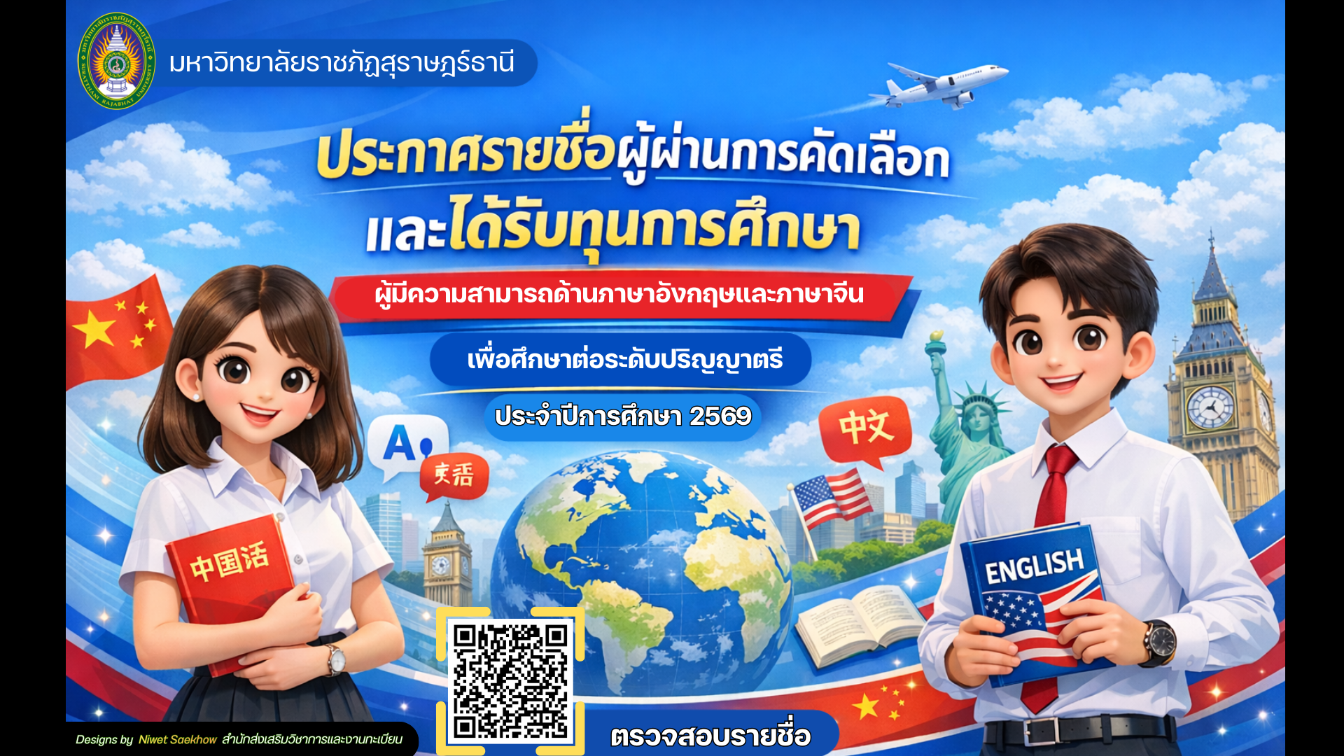 มหาวิทยาลัยราชภัฏสุราษฎร์ธานี ประกาศรายชื่อผู้ผ่านการคัดเลือกและได้รับทุนการศึกษาผู้มีความสามารถด้านภาษาอังกฤษและภาษาจีน เพื่อศึกษาต่อระดับปริญญาตรี ประจำปีการศึกษา 2569