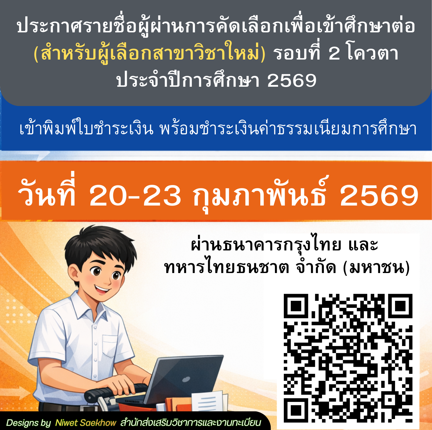 มหาวิทยาลัยราชภัฏสุราษฎร์ธานี ประกาศเรียกรายชื่อผู้มีสิทธิ์เข้าศึกษา จากรายชื่อสำรองการคัดเลือกรอบ 2 โควตา ครั้งที่ 1 เข้าพิมพ์ใบชำระเงินค่ารายงานตัว 28 กุมภาพันธ์ 2569 - 3 มีนาคม 2569 ในระบบรับสมัคร https://reg.sru.ac.th/registrar/apphome.asp ชำระเงินวันที่ 28 กุมภาพันธ์ 2569 -…