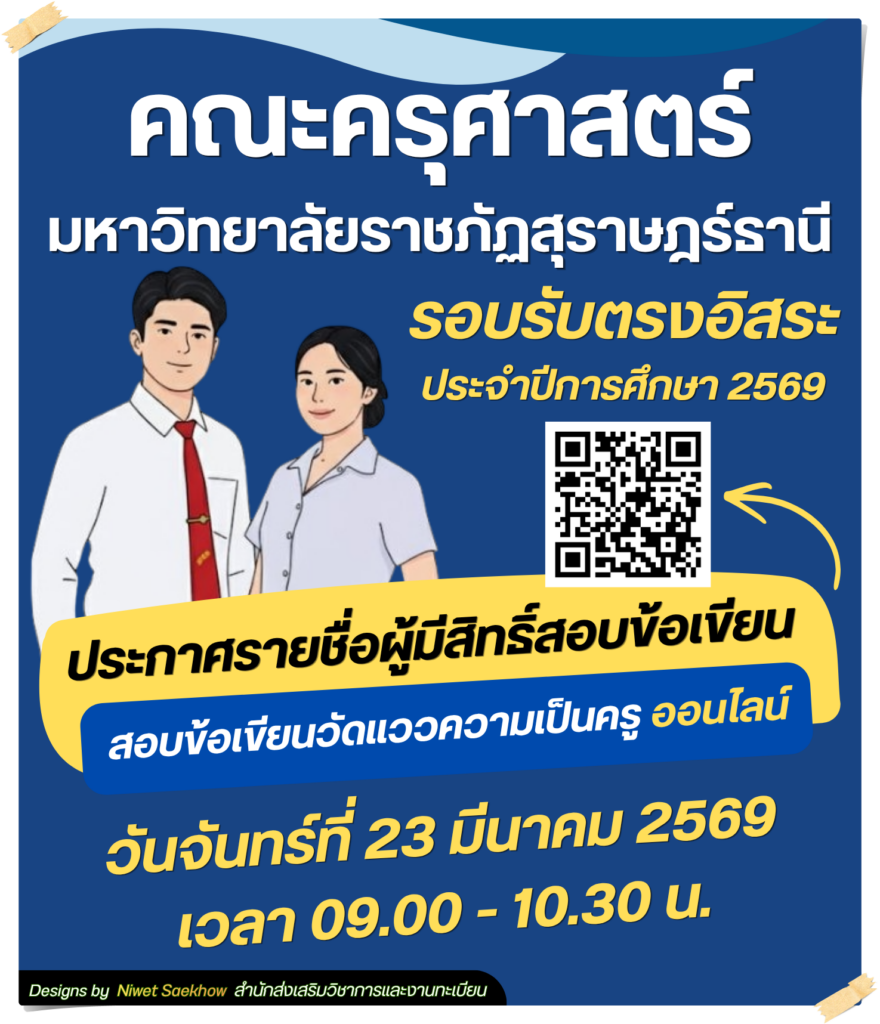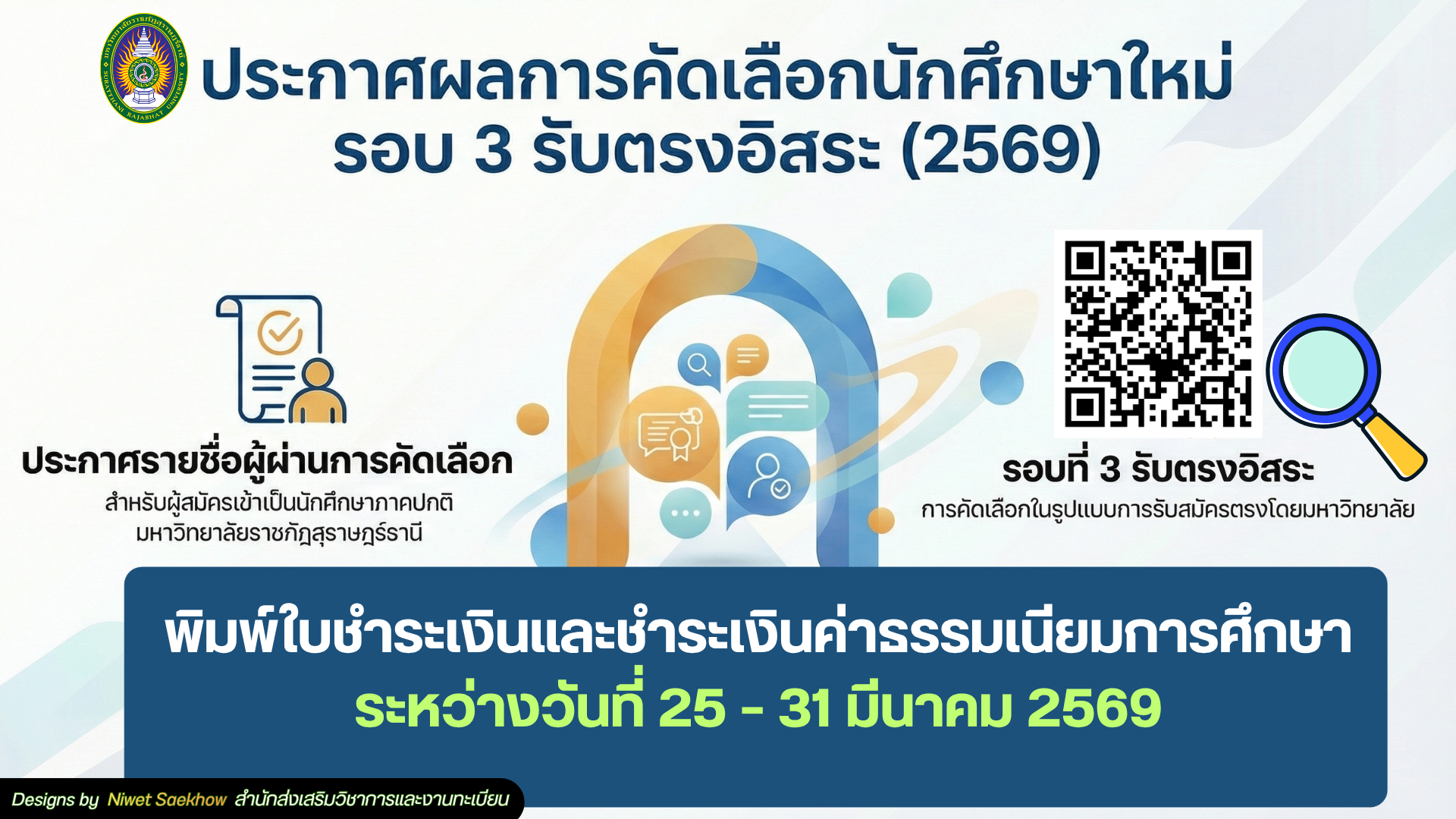 ผู้ผ่านการคัดเลือกเข้าพิมพ์ใบชำระเงินและชำระเงินค่าธรรมเนียมนักศึกษาใหม่ และค่าธรรมเนียมการศึกษาผ่านระบบบริการการศึกษาอิเล็กทรอนิกส์ มหาวิทยาลัยราชภัฏสุราษฎร์ธานี ที่ https://reg.sru.ac.th/registrar/apphome.asp ระหว่างวันที่ 25 - 31 มีนาคม 2569 ผู้ไม่ผ่านการคัดเลือกดำเนินการเลือกสาขาวิชาใหม่ ระหว่างวันที่ 25 มีนาคม 2569…