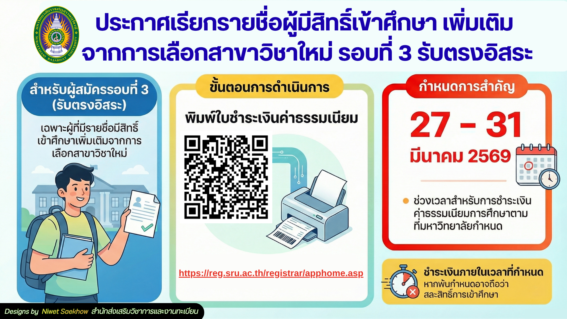 ผู้ผ่านการคัดเลือกเข้าพิมพ์ใบชำระเงินและชำระเงินค่าธรรมเนียมนักศึกษาใหม่ และค่าธรรมเนียมการศึกษาผ่านระบบบริการการศึกษาอิเล็กทรอนิกส์ มหาวิทยาลัยราชภัฏสุราษฎร์ธานี ที่ https://reg.sru.ac.th/registrar/apphome.asp ระหว่างวันที่ 25 – 31 มีนาคม 2569