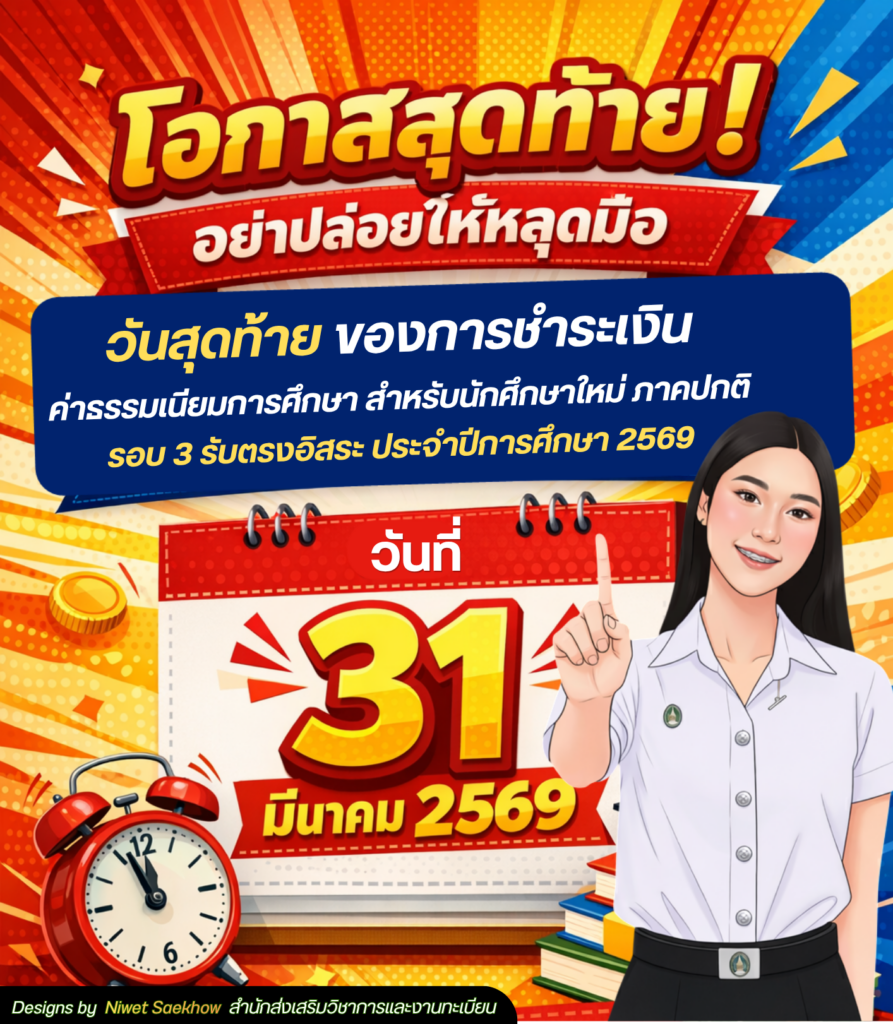 โอกาสสุดท้าย ! อย่าปล่อยให้หลุดมือ วันสุดท้ายของการชำระเงินค่าธรรมเนียมการศึกษา สำหรับนักศึกษาใหม่ ภาคปกติ รอบ 3 รับตรงอิสระ ประจำปีการศึกษา 2569 วันที่ 31 มีนาคม 2569