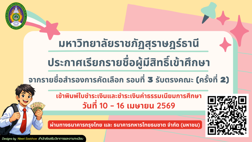มหาวิทยาลัยราชภัฏสุราษฎร์ธานี ประกาศเรียกรายชื่อผู้มีสิทธิ์เข้าศึกษา จากรายชื่อสำรองการคัดเลือก รอบที่ 3 รับตรงอิสระ เข้าพิมพ์ใบชำระเงินและชำระเงินค่าธรรมเนียมการศึกษา วันที่ 6-7 เมษายน 2569 ผ่านธนาคารกรุงไทย และ ธนาคคารทหารไทยธนชาต จำกัด (มหาชน) รายชื่อผู้มีสิทธิ์เข้าศึกษา จากรายชื่อสำรองการคัดเลือก รอบที่ 3 รับตรงอิสระDownload
